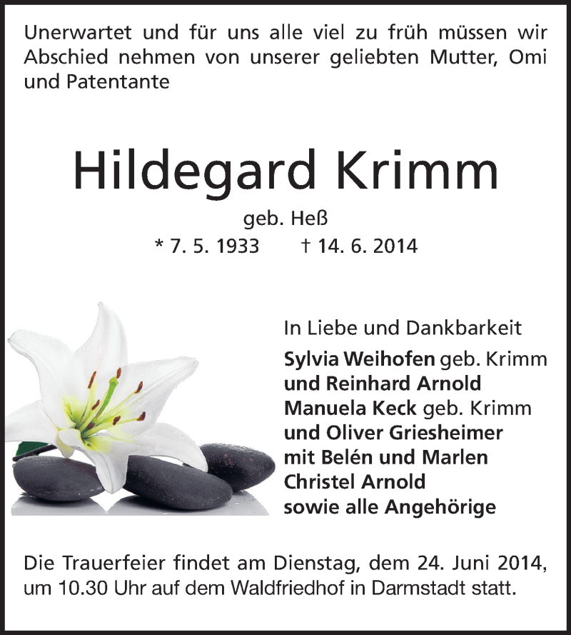 Hier finden Sie alle Traueranzeigen aus der Zeitung, die bisher für Hildegard Krimm erschienen sind. Weitere Traueranzeigen, die in der Zeitung erscheinen, werden hier ebenfalls aufgelistet