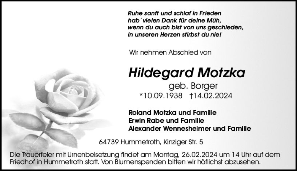 Hier finden Sie alle Traueranzeigen aus der Zeitung, die bisher für Hildegard Motzka erschienen sind. Weitere Traueranzeigen, die in der Zeitung erscheinen, werden hier ebenfalls aufgelistet