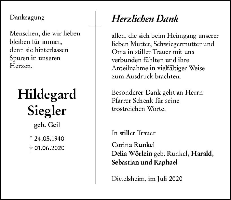 Hier finden Sie alle Traueranzeigen aus der Zeitung, die bisher für Hildegard Siegler erschienen sind. Weitere Traueranzeigen, die in der Zeitung erscheinen, werden hier ebenfalls aufgelistet
