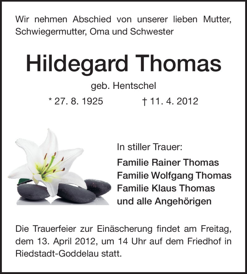 Hier finden Sie alle Traueranzeigen aus der Zeitung, die bisher für Hildegard Thomas erschienen sind. Weitere Traueranzeigen, die in der Zeitung erscheinen, werden hier ebenfalls aufgelistet