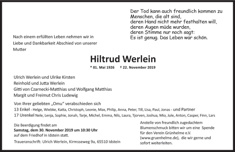 Hier finden Sie alle Traueranzeigen aus der Zeitung, die bisher für Hiltrud Werlein erschienen sind. Weitere Traueranzeigen, die in der Zeitung erscheinen, werden hier ebenfalls aufgelistet
