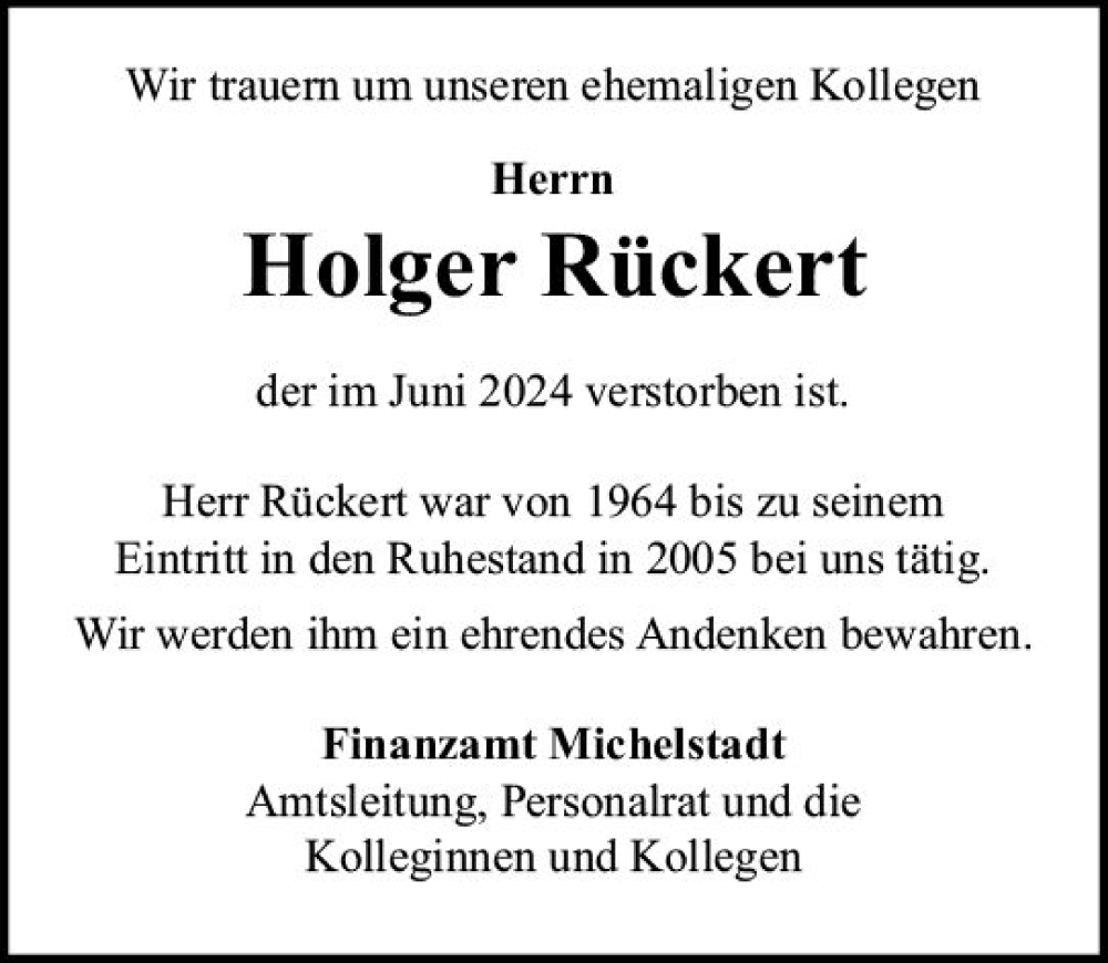 Hier finden Sie alle Traueranzeigen aus der Zeitung, die bisher für Holger Rückert erschienen sind. Weitere Traueranzeigen, die in der Zeitung erscheinen, werden hier ebenfalls aufgelistet