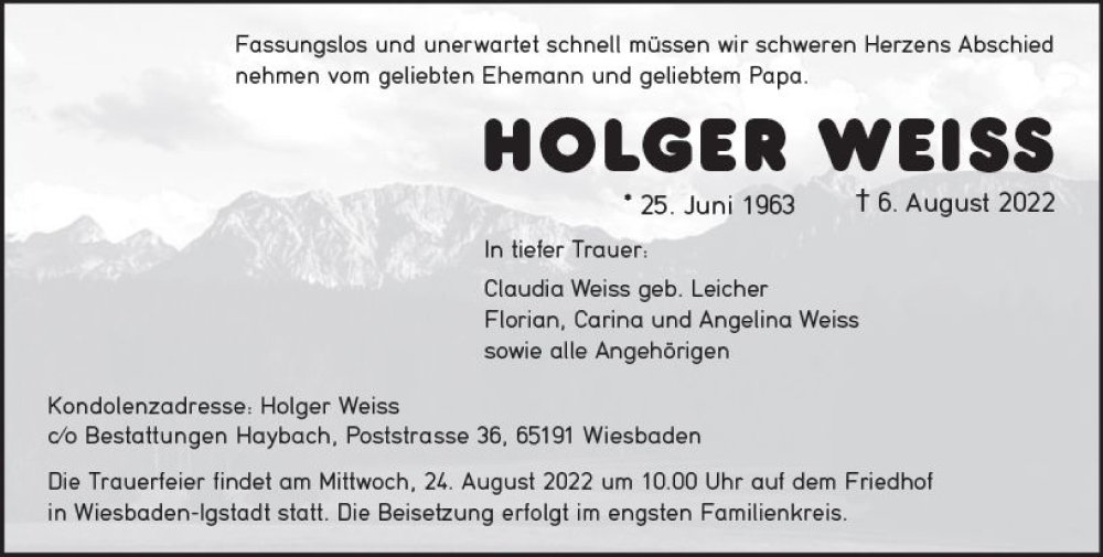 Hier finden Sie alle Traueranzeigen aus der Zeitung, die bisher für Holger Weiss erschienen sind. Weitere Traueranzeigen, die in der Zeitung erscheinen, werden hier ebenfalls aufgelistet