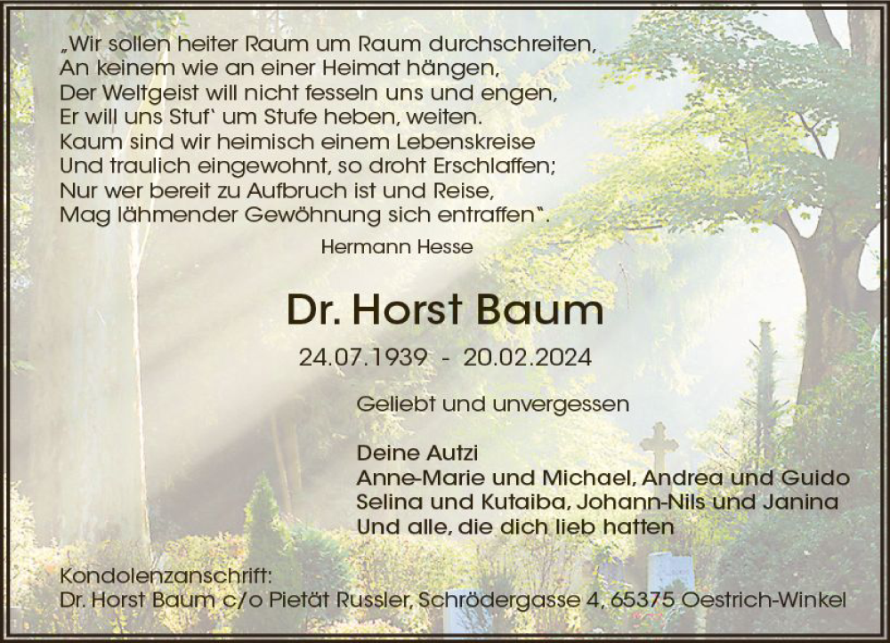 Hier finden Sie alle Traueranzeigen aus der Zeitung, die bisher für Horst Baum erschienen sind. Weitere Traueranzeigen, die in der Zeitung erscheinen, werden hier ebenfalls aufgelistet