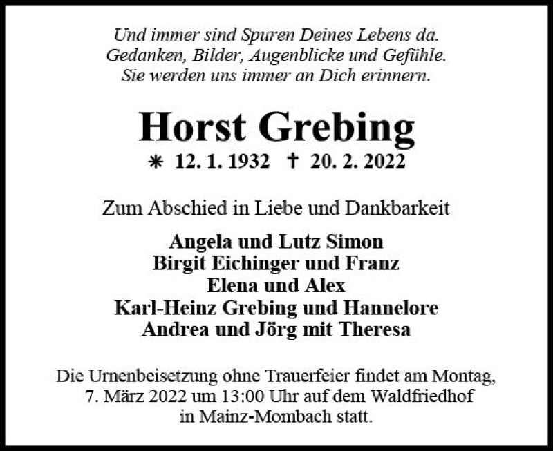 Hier finden Sie alle Traueranzeigen aus der Zeitung, die bisher für Horst Grebing erschienen sind. Weitere Traueranzeigen, die in der Zeitung erscheinen, werden hier ebenfalls aufgelistet