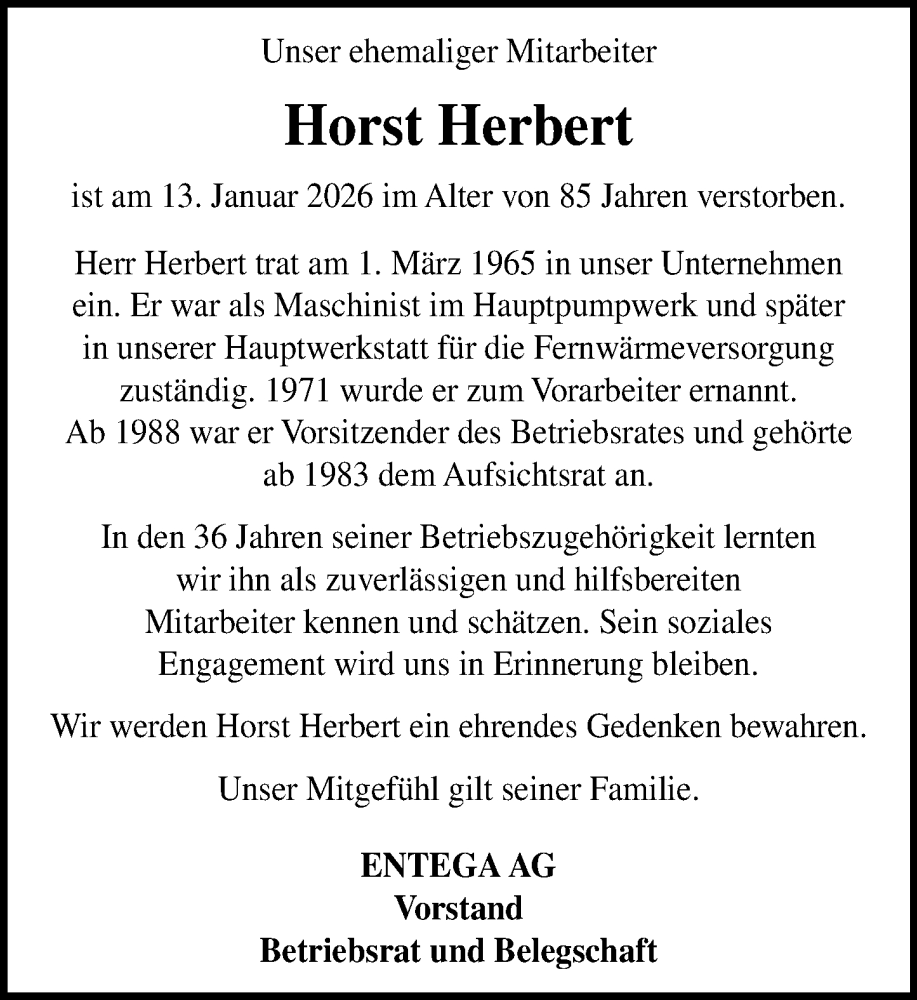 Hier finden Sie alle Traueranzeigen aus der Zeitung, die bisher für Horst Herbert erschienen sind. Weitere Traueranzeigen, die in der Zeitung erscheinen, werden hier ebenfalls aufgelistet