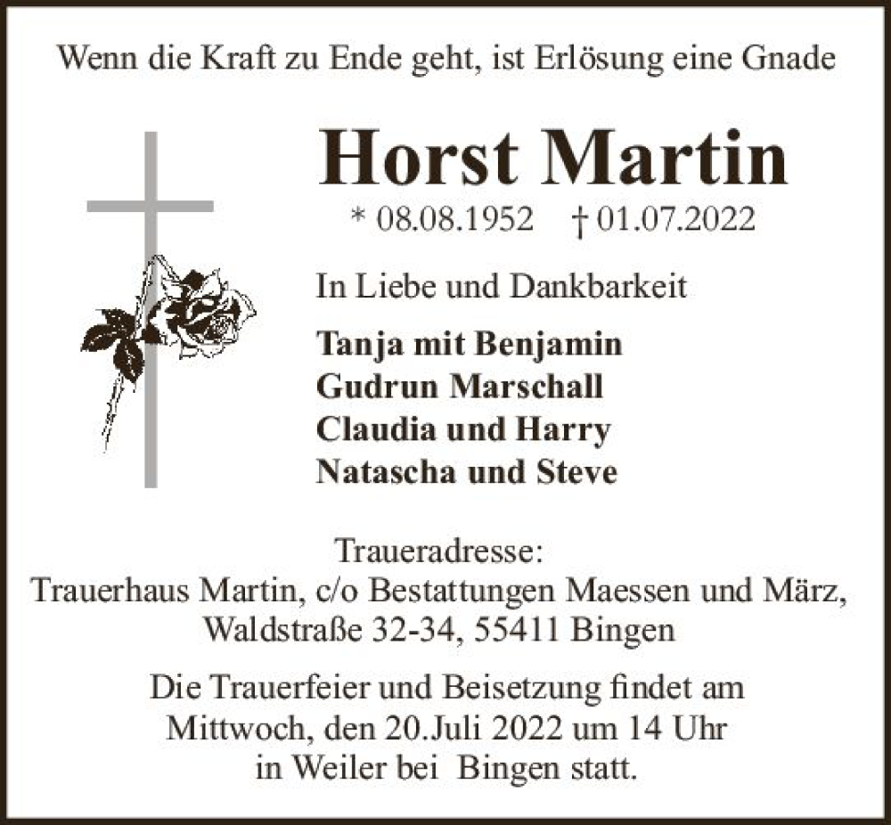 Hier finden Sie alle Traueranzeigen aus der Zeitung, die bisher für Horst Martin erschienen sind. Weitere Traueranzeigen, die in der Zeitung erscheinen, werden hier ebenfalls aufgelistet