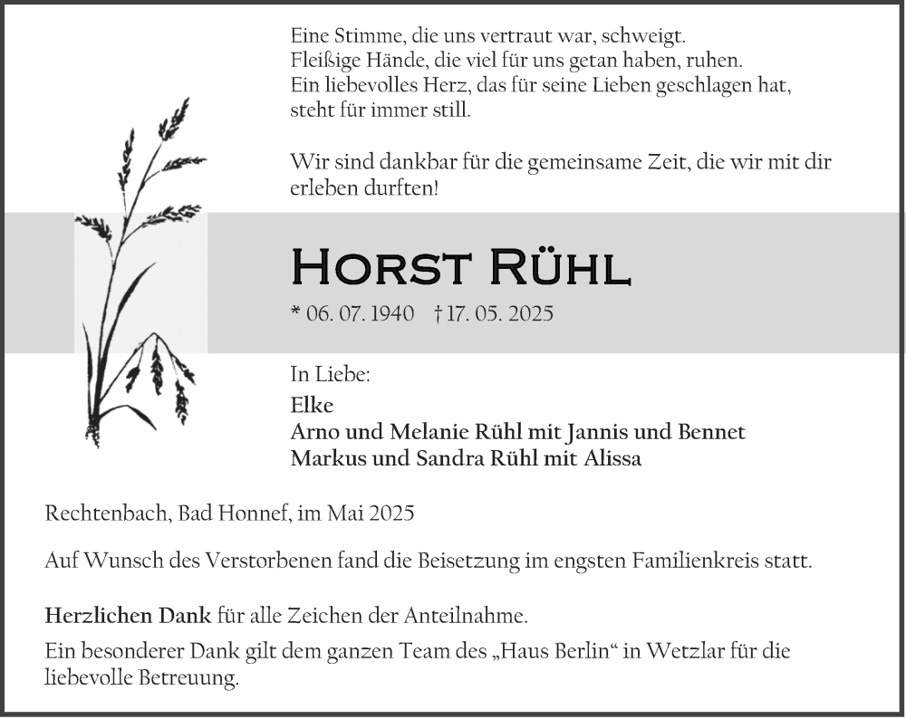 Hier finden Sie alle Traueranzeigen aus der Zeitung, die bisher für Horst Rühl erschienen sind. Weitere Traueranzeigen, die in der Zeitung erscheinen, werden hier ebenfalls aufgelistet
