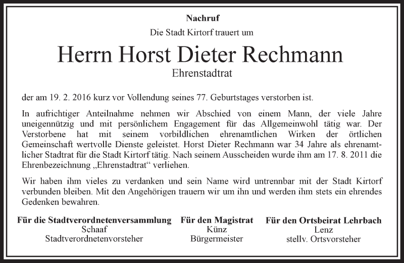 Hier finden Sie alle Traueranzeigen aus der Zeitung, die bisher für Horst Dieter Rechmann erschienen sind. Weitere Traueranzeigen, die in der Zeitung erscheinen, werden hier ebenfalls aufgelistet