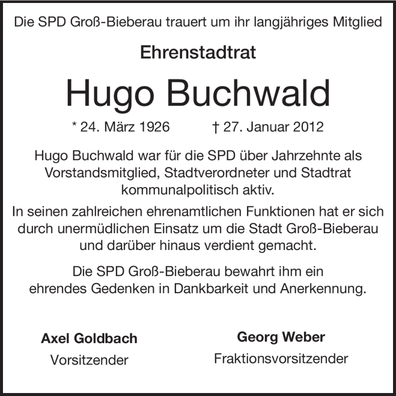Hier finden Sie alle Traueranzeigen aus der Zeitung, die bisher für Hugo Buchwald erschienen sind. Weitere Traueranzeigen, die in der Zeitung erscheinen, werden hier ebenfalls aufgelistet
