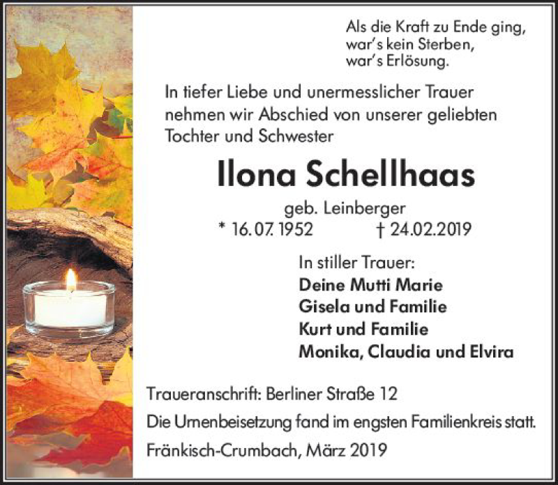 Hier finden Sie alle Traueranzeigen aus der Zeitung, die bisher für Ilona Schellhaas erschienen sind. Weitere Traueranzeigen, die in der Zeitung erscheinen, werden hier ebenfalls aufgelistet