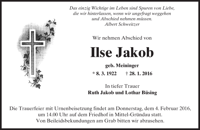 Hier finden Sie alle Traueranzeigen aus der Zeitung, die bisher für Ilse Jakob erschienen sind. Weitere Traueranzeigen, die in der Zeitung erscheinen, werden hier ebenfalls aufgelistet