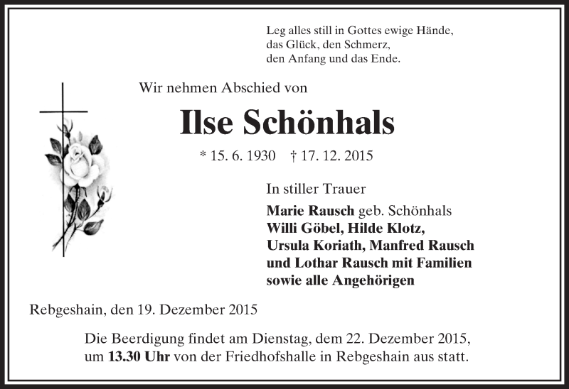 Hier finden Sie alle Traueranzeigen aus der Zeitung, die bisher für Ilse Schönhals erschienen sind. Weitere Traueranzeigen, die in der Zeitung erscheinen, werden hier ebenfalls aufgelistet