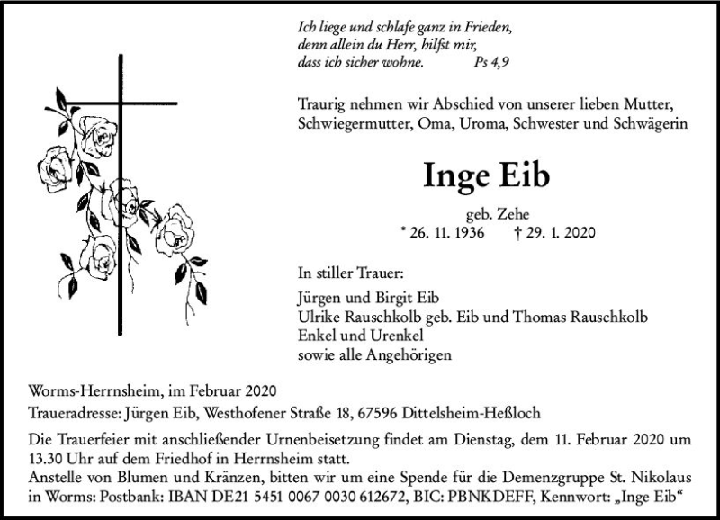 Hier finden Sie alle Traueranzeigen aus der Zeitung, die bisher für Inge Eib erschienen sind. Weitere Traueranzeigen, die in der Zeitung erscheinen, werden hier ebenfalls aufgelistet