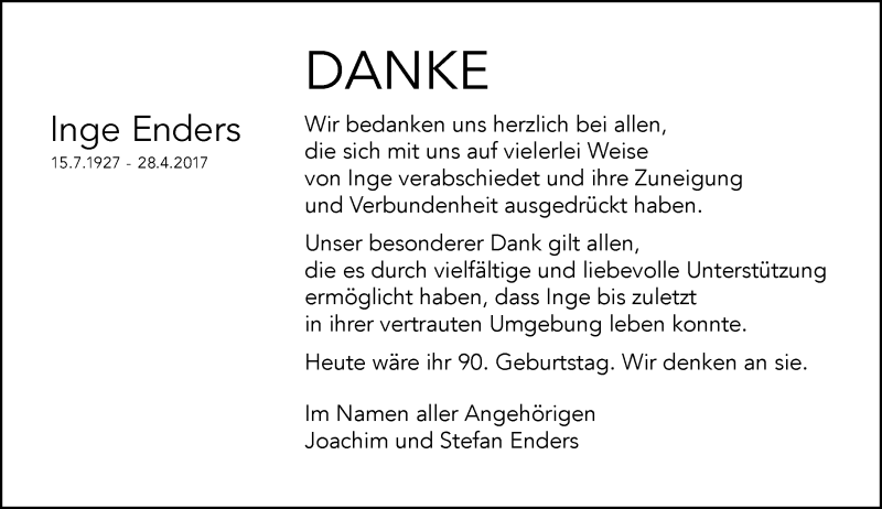 Hier finden Sie alle Traueranzeigen aus der Zeitung, die bisher für Inge Enders erschienen sind. Weitere Traueranzeigen, die in der Zeitung erscheinen, werden hier ebenfalls aufgelistet