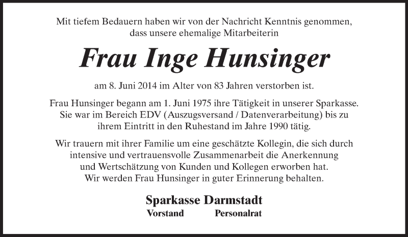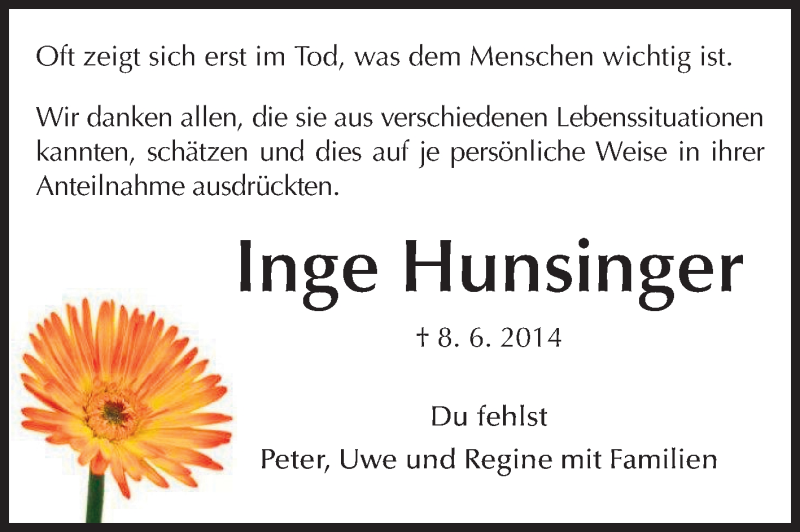 Hier finden Sie alle Traueranzeigen aus der Zeitung, die bisher für Inge Hunsinger erschienen sind. Weitere Traueranzeigen, die in der Zeitung erscheinen, werden hier ebenfalls aufgelistet