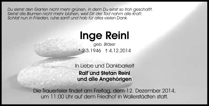 Hier finden Sie alle Traueranzeigen aus der Zeitung, die bisher für Inge Reinl erschienen sind. Weitere Traueranzeigen, die in der Zeitung erscheinen, werden hier ebenfalls aufgelistet