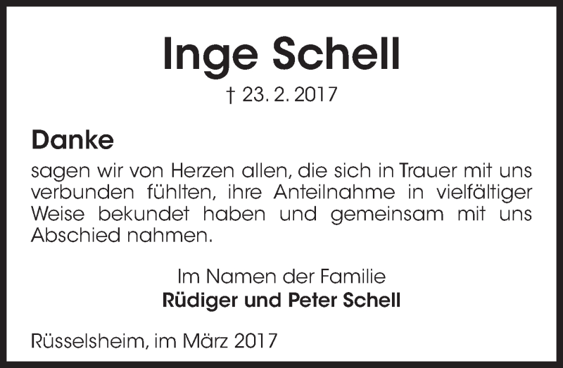 Hier finden Sie alle Traueranzeigen aus der Zeitung, die bisher für Inge Schell erschienen sind. Weitere Traueranzeigen, die in der Zeitung erscheinen, werden hier ebenfalls aufgelistet