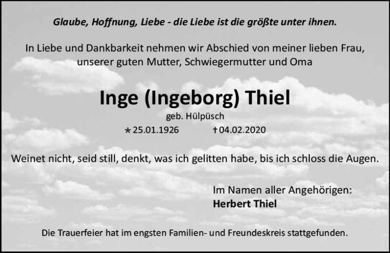 Hier finden Sie alle Traueranzeigen aus der Zeitung, die bisher für Inge Thiel erschienen sind. Weitere Traueranzeigen, die in der Zeitung erscheinen, werden hier ebenfalls aufgelistet