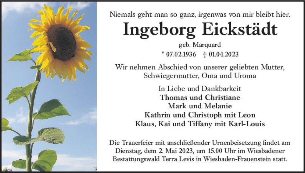 Hier finden Sie alle Traueranzeigen aus der Zeitung, die bisher für Ingeborg Eickstädt erschienen sind. Weitere Traueranzeigen, die in der Zeitung erscheinen, werden hier ebenfalls aufgelistet
