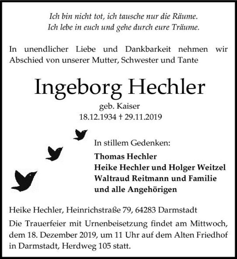 Hier finden Sie alle Traueranzeigen aus der Zeitung, die bisher für Ingeborg Hechler erschienen sind. Weitere Traueranzeigen, die in der Zeitung erscheinen, werden hier ebenfalls aufgelistet