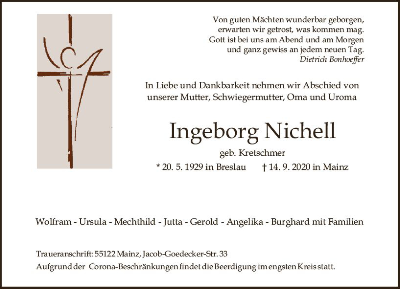 Hier finden Sie alle Traueranzeigen aus der Zeitung, die bisher für Ingeborg Nichell erschienen sind. Weitere Traueranzeigen, die in der Zeitung erscheinen, werden hier ebenfalls aufgelistet