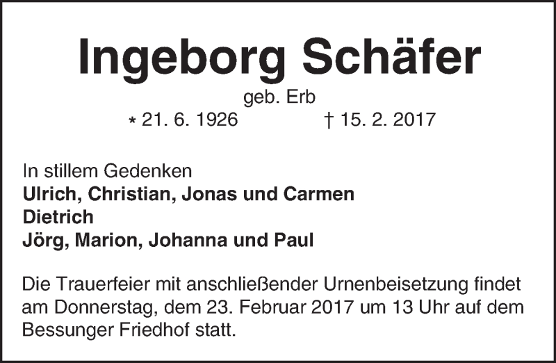 Hier finden Sie alle Traueranzeigen aus der Zeitung, die bisher für Ingeborg Schäfer erschienen sind. Weitere Traueranzeigen, die in der Zeitung erscheinen, werden hier ebenfalls aufgelistet