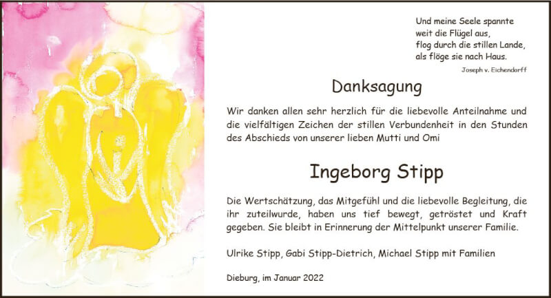 Hier finden Sie alle Traueranzeigen aus der Zeitung, die bisher für Ingeborg Stipp erschienen sind. Weitere Traueranzeigen, die in der Zeitung erscheinen, werden hier ebenfalls aufgelistet