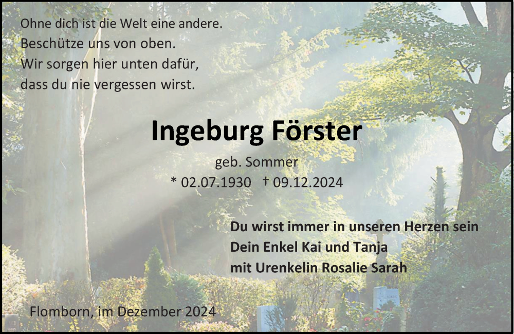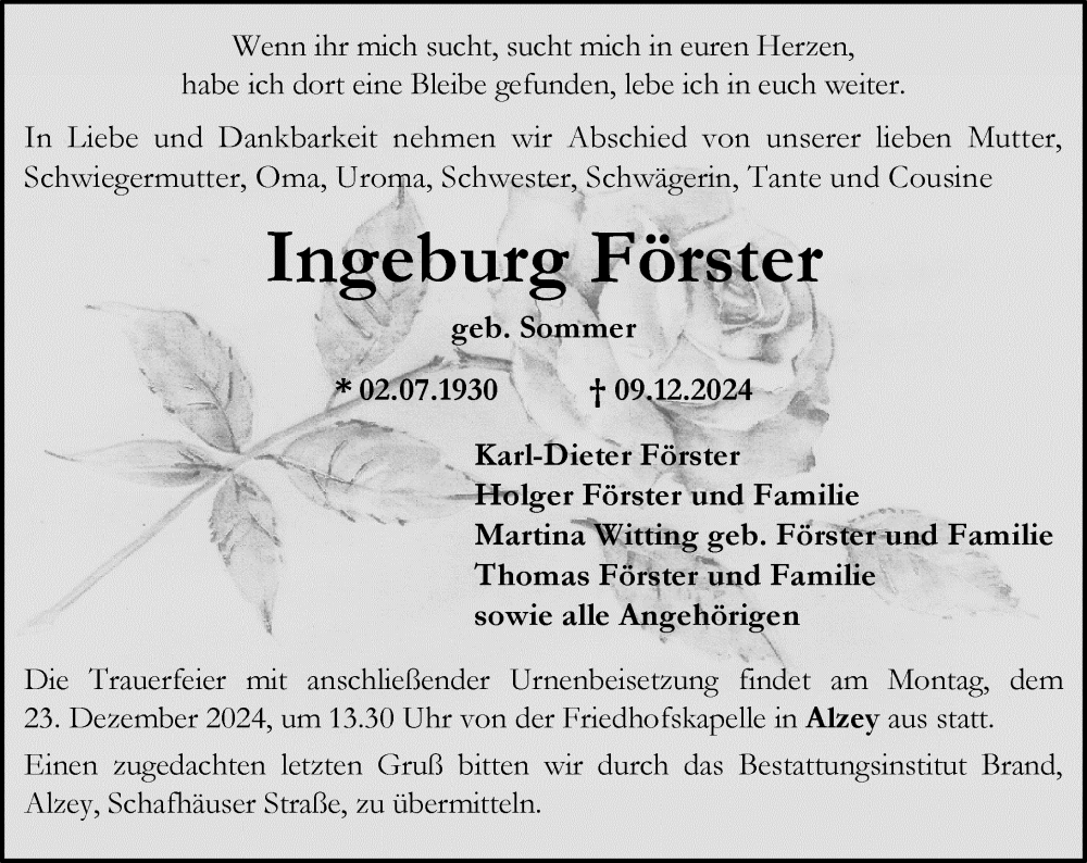 Hier finden Sie alle Traueranzeigen aus der Zeitung, die bisher für Ingeburg Förster erschienen sind. Weitere Traueranzeigen, die in der Zeitung erscheinen, werden hier ebenfalls aufgelistet