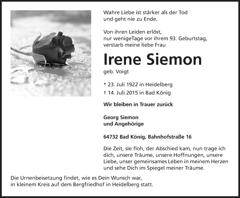 Hier finden Sie alle Traueranzeigen aus der Zeitung, die bisher für Irene Siemon erschienen sind. Weitere Traueranzeigen, die in der Zeitung erscheinen, werden hier ebenfalls aufgelistet