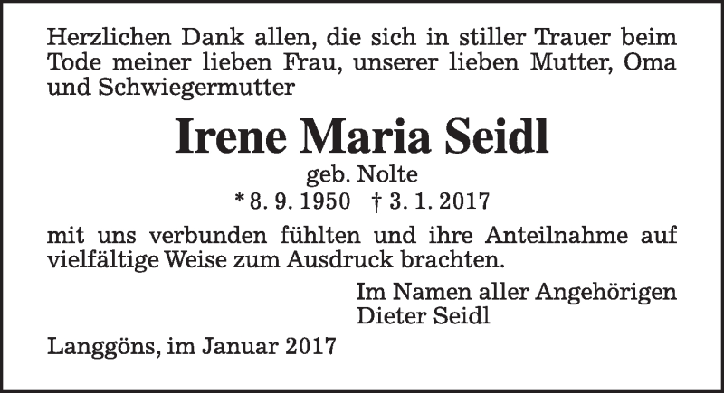 Hier finden Sie alle Traueranzeigen aus der Zeitung, die bisher für Irene Maria Seidl erschienen sind. Weitere Traueranzeigen, die in der Zeitung erscheinen, werden hier ebenfalls aufgelistet