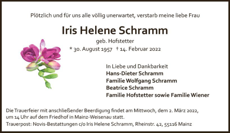 Hier finden Sie alle Traueranzeigen aus der Zeitung, die bisher für Iris Helene Schramm erschienen sind. Weitere Traueranzeigen, die in der Zeitung erscheinen, werden hier ebenfalls aufgelistet