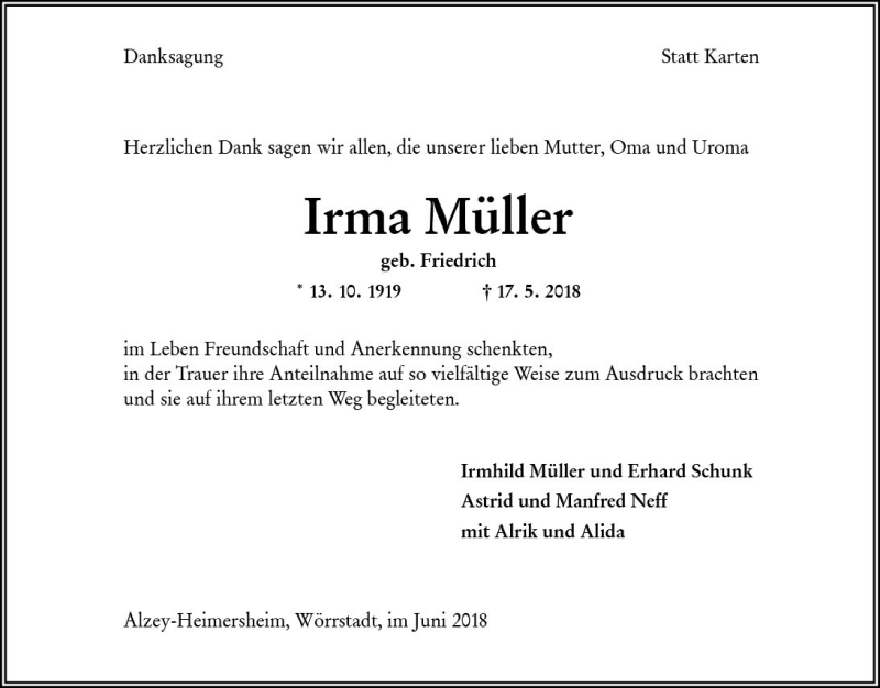Hier finden Sie alle Traueranzeigen aus der Zeitung, die bisher für Irma Müller erschienen sind. Weitere Traueranzeigen, die in der Zeitung erscheinen, werden hier ebenfalls aufgelistet