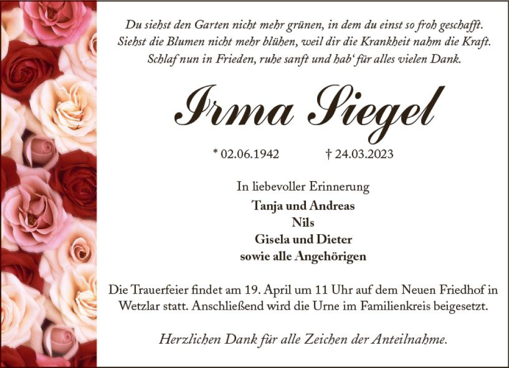 Hier finden Sie alle Traueranzeigen aus der Zeitung, die bisher für Irma Siegel erschienen sind. Weitere Traueranzeigen, die in der Zeitung erscheinen, werden hier ebenfalls aufgelistet