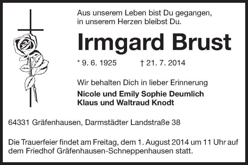 Hier finden Sie alle Traueranzeigen aus der Zeitung, die bisher für Irmgard Brust erschienen sind. Weitere Traueranzeigen, die in der Zeitung erscheinen, werden hier ebenfalls aufgelistet