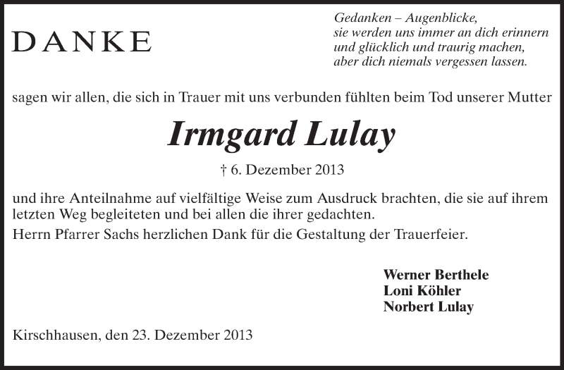 Hier finden Sie alle Traueranzeigen aus der Zeitung, die bisher für Irmgard Lulay erschienen sind. Weitere Traueranzeigen, die in der Zeitung erscheinen, werden hier ebenfalls aufgelistet
