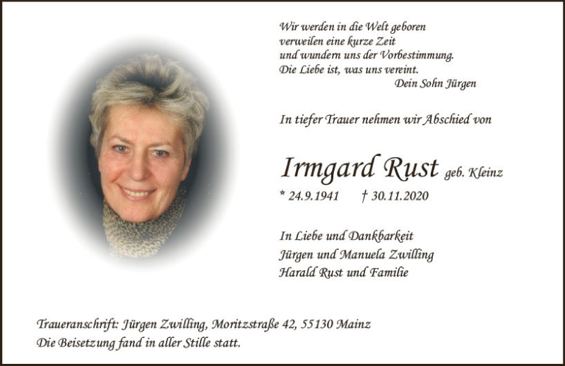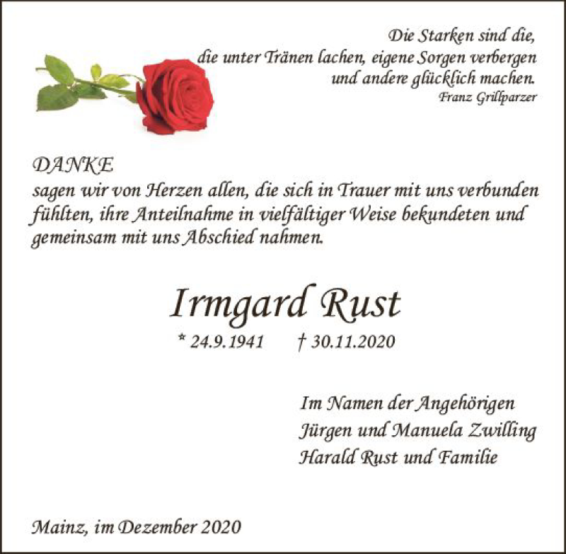 Hier finden Sie alle Traueranzeigen aus der Zeitung, die bisher für Irmgard Rust erschienen sind. Weitere Traueranzeigen, die in der Zeitung erscheinen, werden hier ebenfalls aufgelistet