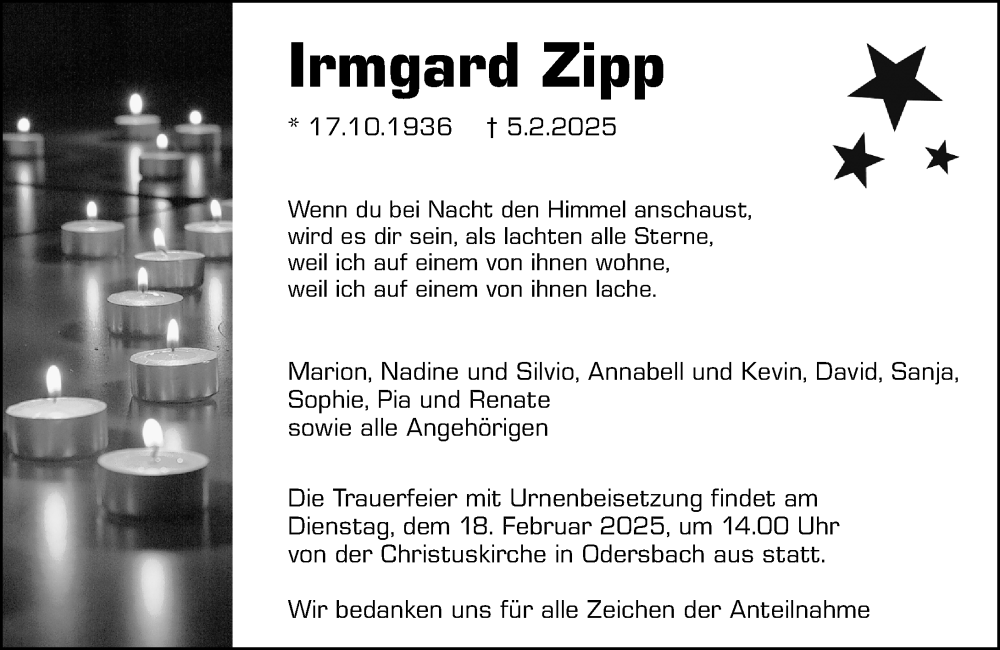Hier finden Sie alle Traueranzeigen aus der Zeitung, die bisher für Irmgard Zipp erschienen sind. Weitere Traueranzeigen, die in der Zeitung erscheinen, werden hier ebenfalls aufgelistet