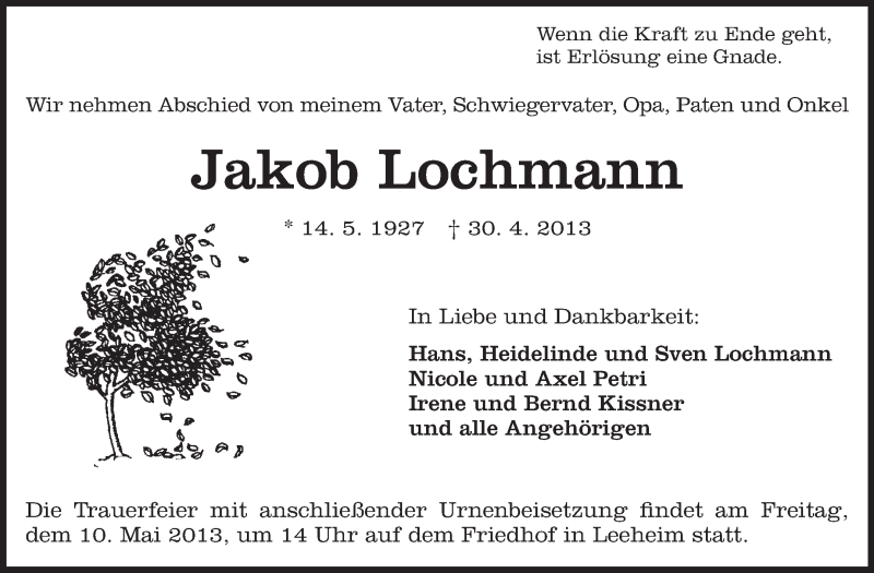Hier finden Sie alle Traueranzeigen aus der Zeitung, die bisher für Jakob Lochmann erschienen sind. Weitere Traueranzeigen, die in der Zeitung erscheinen, werden hier ebenfalls aufgelistet