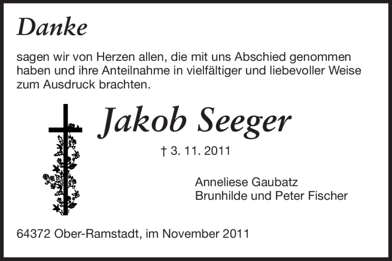 Hier finden Sie alle Traueranzeigen aus der Zeitung, die bisher für Jakob Seeger erschienen sind. Weitere Traueranzeigen, die in der Zeitung erscheinen, werden hier ebenfalls aufgelistet