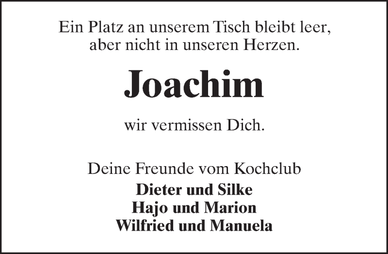 Hier finden Sie alle Traueranzeigen aus der Zeitung, die bisher für Joachim erschienen sind. Weitere Traueranzeigen, die in der Zeitung erscheinen, werden hier ebenfalls aufgelistet