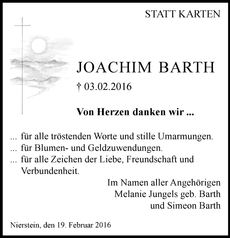 Hier finden Sie alle Traueranzeigen aus der Zeitung, die bisher für Joachim Barth erschienen sind. Weitere Traueranzeigen, die in der Zeitung erscheinen, werden hier ebenfalls aufgelistet