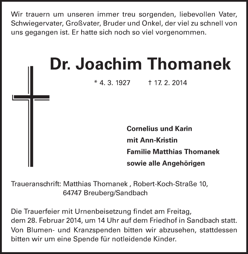 Hier finden Sie alle Traueranzeigen aus der Zeitung, die bisher für Joachim Thomanek erschienen sind. Weitere Traueranzeigen, die in der Zeitung erscheinen, werden hier ebenfalls aufgelistet
