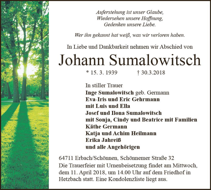 Hier finden Sie alle Traueranzeigen aus der Zeitung, die bisher für Johann Sumalowitsch erschienen sind. Weitere Traueranzeigen, die in der Zeitung erscheinen, werden hier ebenfalls aufgelistet