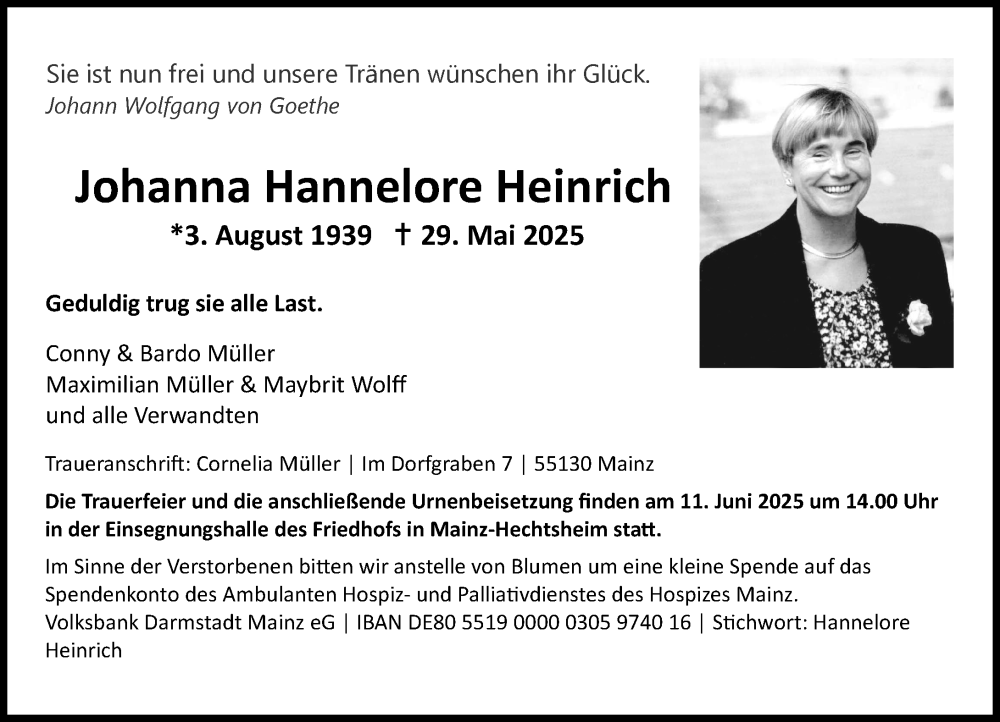 Hier finden Sie alle Traueranzeigen aus der Zeitung, die bisher für Johanna Hannelore Heinrich erschienen sind. Weitere Traueranzeigen, die in der Zeitung erscheinen, werden hier ebenfalls aufgelistet