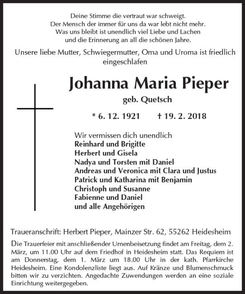Hier finden Sie alle Traueranzeigen aus der Zeitung, die bisher für Johanna Maria Pieper erschienen sind. Weitere Traueranzeigen, die in der Zeitung erscheinen, werden hier ebenfalls aufgelistet