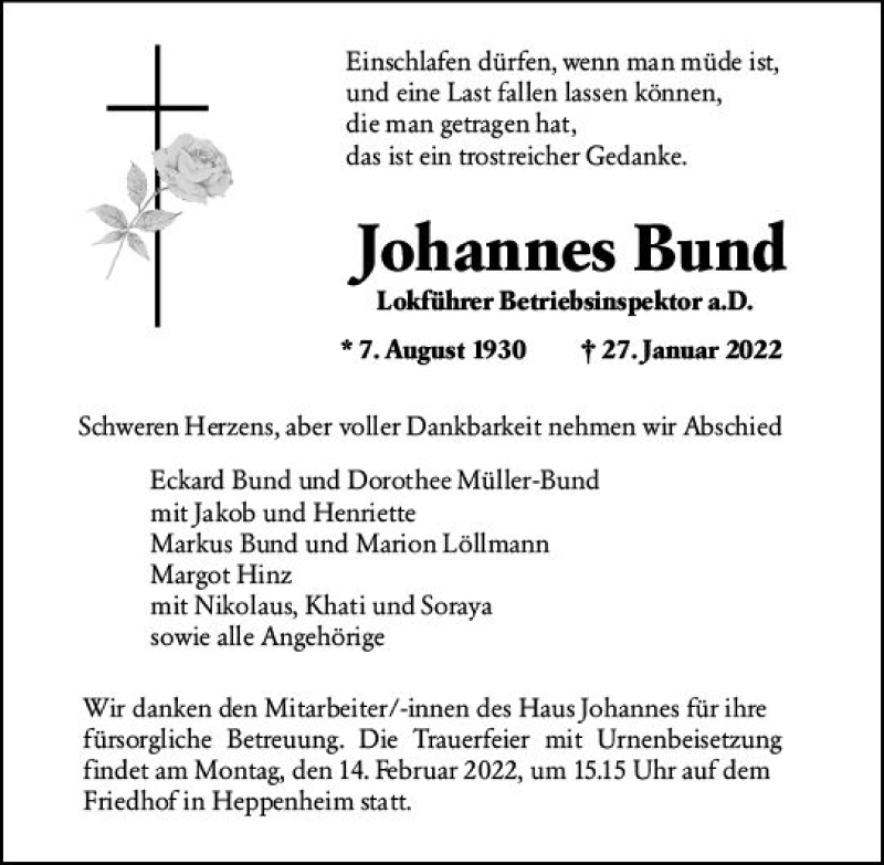 Hier finden Sie alle Traueranzeigen aus der Zeitung, die bisher für Johannes Bund erschienen sind. Weitere Traueranzeigen, die in der Zeitung erscheinen, werden hier ebenfalls aufgelistet
