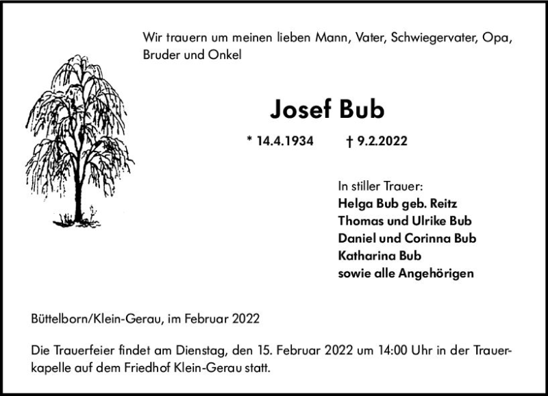 Hier finden Sie alle Traueranzeigen aus der Zeitung, die bisher für Josef Bub erschienen sind. Weitere Traueranzeigen, die in der Zeitung erscheinen, werden hier ebenfalls aufgelistet