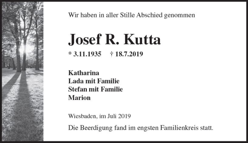 Hier finden Sie alle Traueranzeigen aus der Zeitung, die bisher für Josef R. Kutta erschienen sind. Weitere Traueranzeigen, die in der Zeitung erscheinen, werden hier ebenfalls aufgelistet