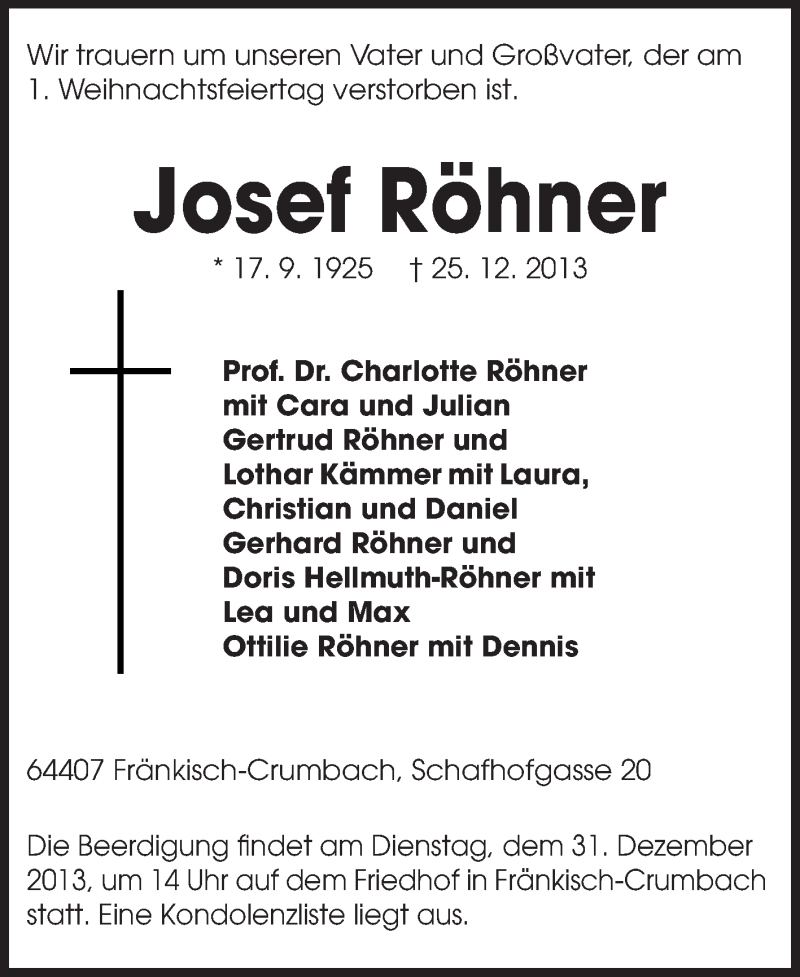 Hier finden Sie alle Traueranzeigen aus der Zeitung, die bisher für Josef Röhner erschienen sind. Weitere Traueranzeigen, die in der Zeitung erscheinen, werden hier ebenfalls aufgelistet